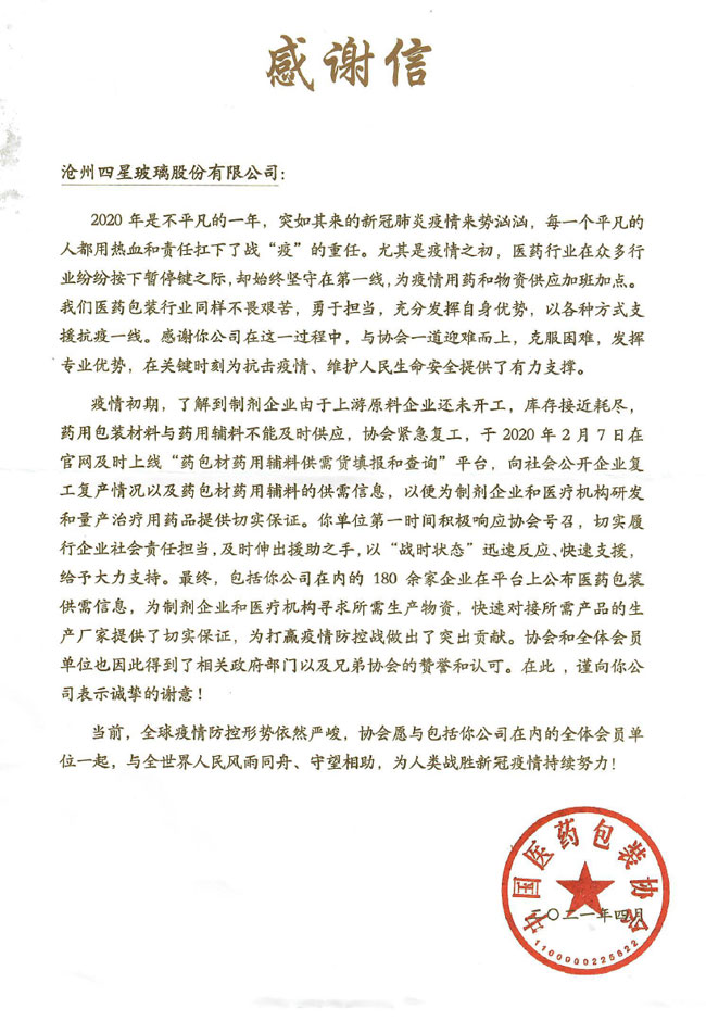 抗擊疫情感謝信-中國醫(yī)藥包裝協(xié)會